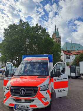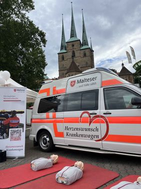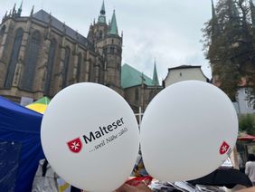 Bereits früh am Morgen waren viele helfende Hände der Malteser im Einsatz, um die Wallfahrt auf dem Domplatz vorzubereiten. Nach dem festlichen Gottesdienst kamen zahlreiche Besucherinnen und Besucher beim Markt der guten Möglichkeiten am Stand der Malteser vorbei: Sie konnten Erste-Hilfe-Maßnahmen ausprobieren, sich über die Angebote der Malteser informieren und einen Rettungswagen besichtigen. Kinder konnten Schmetterlinge als Zeichen der Hoffnung basteln. Und auch für das leibliche Wohl war dank einer leckeren Suppe gesorgt.