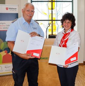 Während des Fachtags gab es nicht nur Urkunden für neu ausgebildete Demokratieberater in den Reihen der Malteser, sondern auch die Unterzeichnung eines besonderen Kooperationsvertrags: Kai-Uwe Lohse, Vorsitzender des Landesfeuerwehrverbands Sachsen-Anhalt, sowie Anke Brumm, kommissarische Geschäftsführerin des Malteser Hilfsdiensts Magdeburg, unterzeichneten eine Vereinbarung, mit der künftig Demokratie gestärkt und gefördert werden soll.