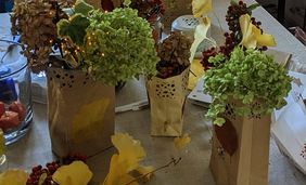 Nach leckerem Kuchen wurde alles was von den Bäumen gefallen war, hübsch angeordnet. So entstanden Gläser mit leuchtenden Naturmaterialen, aber auch bunt beklebte und mit Mustern ausgestanzte Milchtüten.