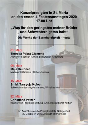 Mit dem Aschermittwoch ging die Faschingszeit vorbei. Damit begann die österliche Buß- und Fastenzeit als Vorbereitung auf das Osterfest. Zur geistlichen Vorbereitung und Einstimmung gehören seit Jahren die Kanzelpredigten in der Kirche St. Maria in Köthen. Unter dem Motto „Was ihr den geringsten meiner Brüder und Schwestern getan habt“, tragen an den ersten vier Fastensonntagen Menschen verschiedener Hilfsdienste- und -organisationen aktuelle Werke der Barmherzigkeit aus ihrer Praxis vor.