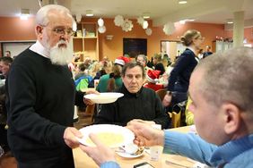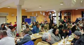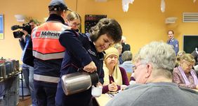 Um das festliche Menü – bestehend aus Kartoffelsuppe (Vorspeise), Kasslerbraten mit Grünkohl und Kartoffeln (Hauptgang) und Mascarpone-Creme mit Zimtsternen (Dessert) – vorzubereiten, war die Kochgruppe aus den Malteser Einsatzdiensten bereits seit 6.30 Uhr auf den Beinen. Für Kinder wurden Schnitzel mit Pommes angeboten.