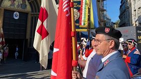 Katja Dörner, OB der Stadt Bonn, mimt nun die englische Royal. Weitere historische Persönlichkeiten werden von lokalen Kulturschaffenden, darunter Rainer Pause und Andreas Etienne, dargestellt. Und obwohl die Bonner Malteser damals nicht geladen – weil noch nicht als Hilfsdienst gegründet – waren, reihen sie sich unter der Führung des Ortsbeauftragten Gerd Mainzer auch optisch wunderbar in den Festumzug ein, der zu Beginn der Feierlichkeiten stattfindet. In offiziellem Ornat trägt Gerd Mainzer die Malteser Fahne voran, der stv. Ortsbeauftragte Dr. Rainer Müller und Helferinnen und Helfer aus den Einsatzeinheiten Bonn und Beuel folgen.
