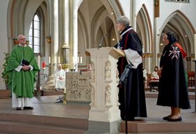 Seit 1996 war Reinhard Heine den Maltesern in der Diözese Hildesheim verbunden: zunächst als Diözesancaritasdirektor, also Leiter der Caritasdienste im Bistum Hildesheim. In dieser Eigenschaft war Heine zugleich geborenes Mitglied im Diözesanvorstand der Malteser in der Diözese Hildesheim. 2002 wurde Heine zum Propst von Braunschweig ernannt. „Auch hier hatten Sie stets ein Herz für die Malteser und hielten schützend und fördernd Ihre Hand über sie“, sagte Max Freiherr von Boeselager, Diözesanleiter der Malteser in der Diözese Hildesheim, bei seiner kurzen Laudatio am Ende des Gottesdienstes. So habe Heine 2008 Diakon Detlef Schötz zum Ortsseelsorger der Malteser in Braunschweig berufen. Der sei längst „mit Leib und Seele Malteser geworden.“ Ein Jahr später richteten die Malteser in Braunschweig ihren „Sozialen Mittagstisch“ für Bedürftige ein, der von Heine gefördert wurde. Auch die jährliche Türkollekte der Braunschweiger Katholiken für die Malteser habe sehr geholfen, sagte von Boeselager, ehe er gemeinsam mit seiner Frau Marie-Rose Freifrau von Boeselager, Diözesanoberin der Malteser in der Diözese Hildesheim, die Dankplakette samt Urkunde überreichte.