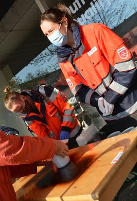 Malteserin Jessica Krause (rechts) hat mit ihrem Kollegen Christian Schmidt die Suppenausgabe fest im Griff; Bildquelle: Lukas/Malteser