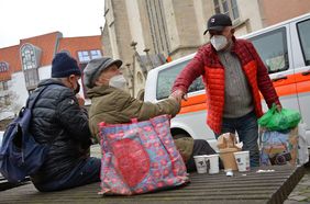 Auch am heutigen Karfreitag, 15. April 2022, haben rund 20 Personen auf den auffälligen rot-weißen Malteserbus gewartet, dem neben Cora Kruse auch Mirko Gärtner und Jessica Krause entsteigen und routiniert ein Suppenbuffet und Kaffeekannen aufbauen. Sabrina und Florian, zwei Ehrenamtliche aus der Fanabteilung des Fußballclubs Eintracht Braunschweig, vervollständigen das Team und verteilen Tüten mit Hygieneartikeln: Toilettenpapier und Papiertaschentücher gehören zum Basisbedarf. Gerne mitgenommen werden auch Seife, Shampoo und Tampons.