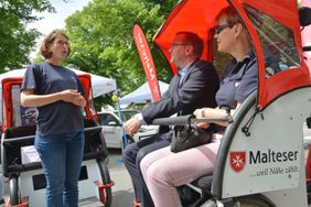 Hannover (mhd). Von der Sonne verwöhnt, mit Wind in den Haaren und einem Lächeln auf den Lippen – so präsentierten sich die Malteser in der Diözese Hildesheim am Wochenende vom 10. bis 12. Juni auf dem „Tag der Niedersachsen“ in Hannover. Bei der „Blaulicht- und Technikmeile“ am Rudolf-von-Bennigsen-Ufer boten sie mit ihren Rikschas aus Hannover und Hildesheim einen farbenfrohen Akzent, der auch Politiker zum Mitfahren animierte.