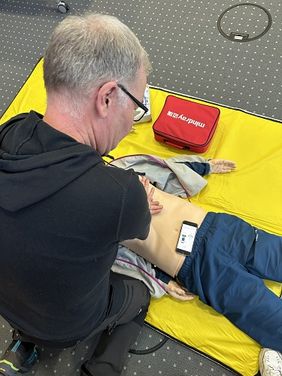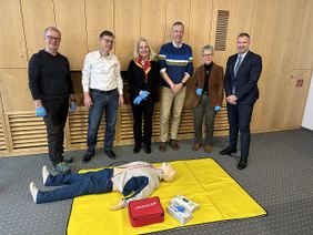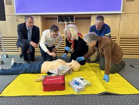 Wie entscheidend und lebensverändernd ein Erste-Hilfe-Kurs sein kann, wird allen am Nachmittag nochmal deutlich. Denn Kursleiter Axel Kinski von den Maltesern berichtet von einem Vorfall in einer Firma im Ruhrgebiet: „Da machen zwei Mitarbeiter eine Zigarettenpause, kommen in den Innenhof – und da liegt ein Kollege am Boden. Und atmet nicht mehr.“ Glücklicherweise sind beide Männer ausgebildete Ersthelfer und beginnen sofort mit einer Herzdruckmassage und der gleichzeitigen Beatmung. Verhalten sich also genau richtig. Sie reanimieren ihren Kollegen so lange, bis der Rettungsdienst eintrifft. Später stellt sich heraus: der Mann hatte einen Herzinfarkt. Und hätte ohne die erste Hilfe seiner Kollegen nicht überlebt. „15 Minuten lang haben die beiden Männer die Reanimation durchgeführt“, erklärt Kinski. Ein Raunen geht durch das Rektorat. Schließlich sind schon wenige Minuten Reanimation herausfordernd. „Die erste Hilfe kann wirklich Leben retten“, betont Rektorin Ada Pellert abschließend. „Und es ist so wichtig, die Scheu zu verlieren und zu lernen, wie es geht. Deshalb möchte ich alle Mitarbeitenden der FernUni ermutigen, an einem Erste Hilfe – Kurs teilzunehmen und Ersthelferin oder -helfer zu werden.“ Die Rektorin wird, gemeinsam mit den anderen Rektoratsmitgliedern, den restlichen Nachmittag weiter die Reanimationstechniken üben - um im Ernstfall einem anderen Menschen das Leben retten zu können.
