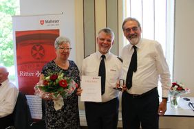 Franz Anton Becker (m.) wurde von Diözesanleiter Wolfgang Penning für seinen 50-jährigen Dienst ausgezeichnet. Für Ehefrau Kornelia Becker gab es Blumen. Foto: Frank Kaiser