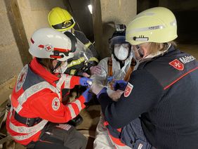 Als der Krankentransportwagen, mit dem Notfall- und Rettungssanitäter ankamen war der vermeintliche Patient ansprechbar. Ein gemischtes Team aus DRK und Maltesern wurde den Schacht hinabgelassen, um den Verletzten medizinisch zu versorgen. Premiere auch für die Kameraden der Feuerwehr. Nach einer Stunde wurde der Patient im Rettungswagen abtransportiert. Die unter Schock stehende “Kollegin” wurde ebenfalls medizinisch versorgt. An dieser Stelle wurde die Übung beendet. Nach dem alles abgebaut wurde folgte die Nachbesprechung der Übung. Alle Einsatzkräfte waren mit dem Verlauf zufrieden.