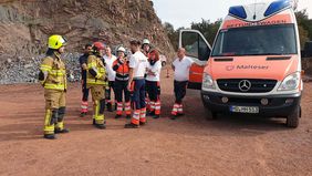 Drei Szenarien wurden am Sonnabend im Steinbruch „Harzer Grauwacke Rieder“ trainiert. Die Übungen sind gespickt mit besonderen Herausforderungen: So muss ein Kind reanimiert werden, das im Steinbruch abgerutscht ist und teilweise verschüttet wurde. Auch wenn die Sonne hoch Himmel steht und den Rettern in ihrer Kluft sichtlich warm ist, herrschen für die Übung „kalte Tage Ende Herbst, Anfang Winter. Das Kind ist inzwischen stark unterkühlt“, schildert Malteser Notfallsanitäter und Praxisanleiter Lars Einecke die Übungssituation. „Die Kollegen im Rettungsdienst müssen deshalb bei der Reanimation anders agieren. Aber vor allem brauchen Sie Geduld. Denn die Bergung bei losem Gesteinsmaterial in einem Steinbruch ist auch für erfahrene Feuerwehrkollegen nicht einfach.“ Immer könne Material nachrutschen und damit auch Einsatzkräfte gefährden.