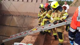 Ohne weiteres können die Retter nicht zur Patientin vordringen. Erst müssen die Notfallsanitäter mit Gurtzeug und Seilen gesichert und dann kontrolliert in den Trichter absteigen. Nach und nach wird Rettungsgerät am Seil herabgeführt, die Verletzungen abgeklärt, eine Rettungsdecke ausgebreitet, eine Infusion gelegt, der Überwachungsmonitor angeschlossen. Und dann die entscheidende Frage: Wie bekommen die Einsatzkräfte die Patienten aus der Tiefe heraus? Das ist der Moment für die Feuerwehr. Die schweren Maschinen des Drehleiterwagens starten. Am Rettungskorb wird eine Trage befestigt, das Fahrzeug vorsichtig zum Trichter manövriert, um die Trage herablassen zu können, für die der Platz gerade eben so reicht …