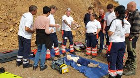 An anderer Stelle müssen die Teams höchste Sensibilität in der Handhabung des technischen Geräts beweisen. Eine Person in einem sogenannten Dumper, einem Fahrzeug im Steinbruch, benötigt medizinische Hilfe: „Da müssen die Retter erstmal reinkommen und überlegen, wie sie die Person aus dem Fahrzeug holen. Denn der Patient hat ein Aortenaneurysma. Ein falscher Handgriff, eine unbedachte Erschütterung und es kommt zur Dissektion. Platzt das Aneurysma in der Hauptschlagader, wäre der Patient sofort tot“, sagt Einecke. Und in diesem Übungsfall verschlechtert sich die Situation zusehends. „Um das Risiko zu minimieren, braucht der Patient eine Schutznarkose und muss intubiert werden.“