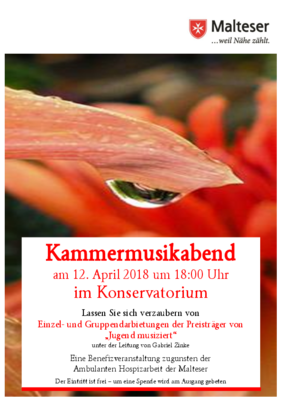 In Cottbus engagieren sich seit vielen Jahren junge Musiker vom Konservatorium für die Begleitung schwerkranker, sterbender und trauernder Menschen in unserer Region. Die Preisträger von „Jugend musiziert“ geben am 12. April 2018 um 18:00 Uhr im Konservatorium Cottbus ein Kammerkonzert (Benefizkonzert) zur Unterstützung der Malteser Hospizarbeit.