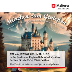 Am Samstag, den 25. Januar 2025, um 17:00 Uhr findet im Lesecafé der Stadt- und Regionalbibliothek im LERNZENTRUM (Berliner Straße 13/14, Cottbus) eine Benefizveranstaltung für die ganze Familie der Malteser statt. Der Abend steht im Zeichen von Märchen aus aller Welt und bietet eine Gelegenheit, die Begleitung schwerkranker, sterbender und trauernder Menschen in Cottbus mit einer Spende zu unterstützen.