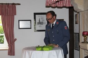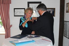 Dann ging es zur Ehrung. Landrat Winter übernahm, nach einem kurzen Blick in die umfangreiche Trageordnung, das Anheften des Verdienstkreuzes, zwei Handbreit unter der linken Schulter.