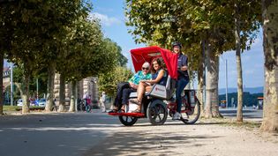 Das Einsteigen in die Rikscha wird dank eines abklappbaren Fußbretts erleichtert - die gepolsterte Sitzauflage bietet Platz für ein bis zwei Fahrgäste, außerdem Stauraum für eine Handtasche. Ein Sicherheitsgurtsystem sorgt für gutes Sicherheitsgefühl, und gegen Wind und Sonne schützt ein Dach über dem Kopf. Natürlich ist auch eine wasserabweisende Decke dabei – falls doch einmal das Wetter umschlägt!