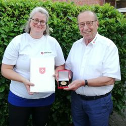 mehrFür 26 Jahre unermüdlicher ehrenamtlicher Arbeit im Stadtverband Emsdetten zeichnete der Ehrenstadtbeauftragte Wolfgang Krüper auf Bitten des Präsidenten nun Dagmar Brunner mit der Verdienstplakette in Gold aus. Krüper: „Es ist die bisher längste Begründung für eine Auszeichnung, so vielfältig hat sich Dagmar in den 26 Jahren bis zum heutigen Tage eingebracht und infizierte später auch ihre Familie mit dem Malteser Gen“. Wie oft begann ihr Einsatz als Gruppenleiterin in der Jugend, Jahre als Erste-Hilfe Ausbilderin kamen hinzu, Einsätze in der Notfallvorsorge und im Katastrophenschutz, beim Seniorenkarneval und Vielem mehr. „Sie half und hilft, wo gerade Hilfe gebraucht wird und das über viele Jahre und alle Bereiche hinweg“, sagt Michael Vehoff, Stadtbeauftragter in Emsdetten.