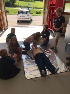 Im Anschluss wurde dann fleißig geübt: Mit einem Simulator wurde das richtige Absetzen eines Notrufes geübt, außerdem die richtige Durchführung der Seitenlage bei bewusstlosen Personen und das richtige Anlegen von Verbänden und Pflastern. Als besonderes Highlight konnten alle Kinder das Herzensretter-Abzeichen in den Stufen Bronze und Silber ablegen. Dabei werden die grundlegenden Techniken der Herz-Lungen-Wiederbelebung vermittelt und gründlich geübt. Alle haben die Stufe Silber mit Bravour gemeistert und konnten vor der Verabschiedung stolz ihre Urkunde entgegennehmen.