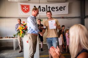 Im Anschluss zeichnete unser Diözesanleiter Magnus von Canstein gemeinsam mit Diözesangeschäftsführer Martin Rösler die Helferinnen und Helfer mit der Feuerwehr und Kathastrophenschutz-Einsatzmedallie des Landes Nordrhein-Westfalen aus.