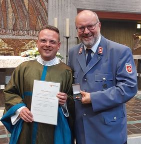 Thomas Renzel, ehrenamtlicher Referent Pastoral der Malteser in der Erzdiözese Paderborn und Mitglied des Diözesanvorstandes, überreichte die Urkunde und zusätzlich auch die Malteser Bandschnalle für 10-jährige Mitgliedschaft. In seiner kurzen Ansprache in der Kirche verabschiedete Thomas Renzel den scheidenden Stadtseelsorger und überbrachte den Dank des Diözesanvorstandes für Schmidtkes Wirken und Arbeiten in Herne.