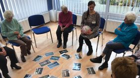 Anlässlich des Tags der offenen Tür unterhielt Ingrid Brütting, Psychotherapeutin mit Erfahrung mit dem Thema Demenz, die Runde aus Gästen, ehrenamtlichen Helferinnen und Leiterin Saskia Lenz mit alten Liedern, die sie mit dem Akkordeon begleitete. „Gedanklich und musikalisch konnten wir so eine Reise von der Mosel an die Nordsee, nach Wien und schließlich zurück nach München unternehmen“, berichtete Lenz anschließend. Später ging es in der Runde noch um Wörter, die in Vergessenheit geraten, wie Brimborium, Krimskrams oder Plemplem. Da bei Demenzkranken das Langzeitgedächtnis am längsten seine Funktion behält, sind Geschichten und Lieder „von früher“ ein wesentliches und regelmäßig verwendetes Element der Aktivierung im Café Malta.