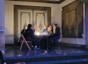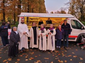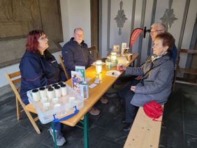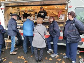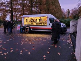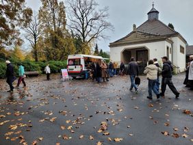 Mit unserem Wärmebus und einem Pavillon samt Tisch und Stühlen standen wir von 14:00 bis 18:00 Uhr an der Trauerhalle des Zentralfriedhofs in Gladbeck Mitte. Der Pavillon konnte im Auto bleiben, wir durften unsere Sitzgelegenheit im Eingangsbereich der alten Trauerhalle aufbauen, dort waren unsere Besucher vor Regen und Wind gut geschützt.