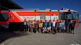 Stuttgart. Am Samstag, den 27. August fand eine Weiterbildung der besonderen Art für die Malteser in Göppingen statt. Die Malteser-Helfer begaben sich an den Landesflughafen Stuttgart, wo sie durch einen Mitarbeiter der Flughafenfeuerwehr einen Einblick in die Aufgaben und Tätigkeiten am sechstgrößten Flughafen Deutschlands erhielten. Neben der Besichtigung der unterschiedlichen Feuerwehrfahrzeuge, wurde uns ein Flughafenlöschfahrzeugs (FLF) live vorgeführt. Bei dem Fahrzeug handelt es sich um ein 52 Tonnen schweres Flugfeldlöschfahrzeug der Marke Magiurs vom Typ Super Dragon X8, welches über einen 17.000 Liter fassenden Wassertank verfügt und den Funkrufnamen ROT 6 hat. Es war beeindruckend zu sehen, welche Wassermassen innerhalb kürzester Zeit für das Löschen von brennenden Flugzeugen zur Verfügung stehen und über den Dachmonitor versprüht werden können. Wahlweise ist auch das Beimischen von Schaum oder Pulver möglich.
