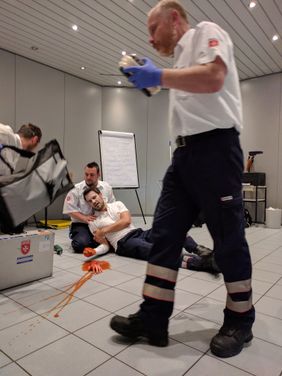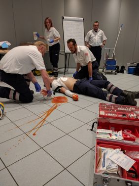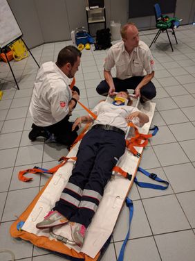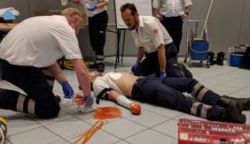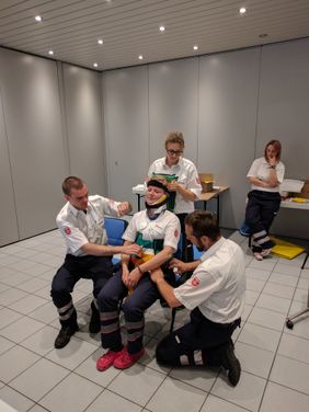Alle 80 Sekunden wird ein Verkehrsteilnehmer in Deutschland verletzt. Alle 8 Minuten sogar schwer. Alle 2,5 Stunden ein Verkehrstoter. Es dauert nur Sekunden… eine kleine Unaufmerksamkeit, ein Blick aufs Handy… ein Knall – Blech verbiegt sich, Glas splittert… Ein Verkehrsunfall hat sich ereignet. Verkehrs-, Arbeits- und Freizeitunfälle fordern die Rettungsdienste in Deutschland gerade in der Sommerzeit immer mehr. Genau um diese Szenarien drehte sich am 08. Juli 2017 eine ganztägige Rettungsdienst-Fortbildung der Malteser in Uhingen. 12 ehren- und hauptamtliche Rettungskräfte starteten um 8:00 Uhr zum Thementag. Nach einer kurzen Einführung von Fortbildungsleiter Marc Feuerbach in den Ablauf des Tages, wurden kleine Gruppen gebildet. Jede Gruppe bekam ein Hilfsmittel der Traumaversorgung an die Hand, welches in der kommenden Stunde besprochen und als Kurzreferat ausgearbeitet werden sollte. Alle Gruppen bearbeiteten in der vorgegebenen Zeit präzise Indikation, Kontraindikation, Personaleinsatz sowie Vor- und Nachteile und stellten diese im Anschluss dem gesamten Auditorium vor. Hier wurde besondere Sorgfalt auf das praktische Vorstellen der Hilfsmittel sowie der benötigten Technik gelegt. Anschließend wurden Spineboard, KED-System, Schaufeltrage und Vakuummatratze von jeder Gruppe in der Anwendung geübt. Hier entstanden Ansätze zur Verbesserung von bereits erlernten Techniken und Handlungsempfehlungen sowie Optimierung der Beladung des Rettungswagens, welche diskutiert wurden. Nach einer kurzen Mittagspause sollte das Erlernte in der Praxis, in sogenannten Fallbeispielen, angewandt werden. Hierfür wurden von Marcus Jolly, Rettungsassistent und passioniert in der realistischen Unfalldarstellung tätig, spritzende Amputationsverletzungen, Schürfwunden und Prellmarken an den Kollegen geschminkt. Es wurden entsprechende Fallbeispiele initiiert, welche von den frei zusammengestellten Rettungsteams abgearbeitet werden mussten. Diese wurden vom restlichen Auditorium interessiert aber auch kritisch beäugt. Speziell auf das sogenannte C-ABCDE-Schema (Compression – Airway, Breathing, Circulation, Disability, Exposure/Environment) sowie die daran anschließende SAMPLER-Anamnese (signs and symptoms, allergies, medications, past medical history, last oral intake, events prior to illness/injury, risk factors) wurde in der Bearbeitung der Fälle und in der Nachbesprechung großer Wert gelegt. In einer kurzen Abschlussrunde ließ der Fortbildungsleiter den Tag Revue passieren. Im persönlichen Fazit wurden nochmals die individuellen Ergebnisse sowie Schwerpunkte aufgenommen. Auch in Zukunft soll das Traumamanagement und weitere Schwerpunktthemen in Fortbildungstagen sukzessive trainiert werden - da waren sich alle einig.