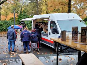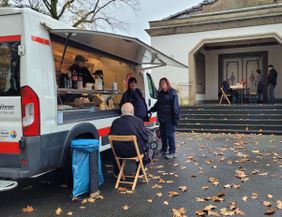 Mit unserem Wärmebus und einem Pavillon samt Tisch und Stühlen standen wir von 14:00 bis 18:00 Uhr an der Trauerhalle des Zentralfriedhofs in Gladbeck Mitte. Der Pavillon konnte im Auto bleiben, wir durften unsere Sitzgelegenheit im Eingangsbereich der alten Trauerhalle aufbauen, dort waren unsere Besucher vor Regen und Wind gut geschützt.