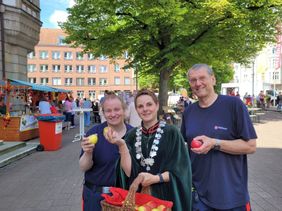 Auch für Erwachsene wurde einiges geboten. Die Stände mit landestypischen Spezialitäten und Leckereien waren gefragt und mitten durch den Trubel schritt huldvoll unsere Appeltatenkönigin, einen Korb mit knackigen, frischen Äpfeln am Arm. Da mussten wir natürlich zugreifen.