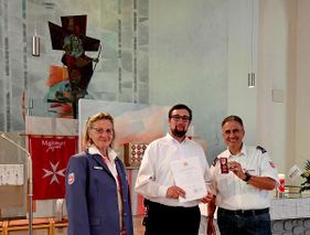 Der Stadtbeauftragte Thomas Ohm eröffnete danach die offizielle Mitgliederversammlung mit einer persönlichen Rede. Bevor die Tätigkeits- und Finanzberichte folgten, übernahm der Ehrengast, die stellv. Diözesanleiterin Johanna Gräfin von Brühl, einige besondere Ehrungen: So wurde der Leiter Einsatzdienste Kevin Krumm mit der Verdienstmedaille 'pro merito melintensi' UCRAINA ausgezeichnet. Mit dieser silbernen Medaille ehrt der Souveräne Malteser Ritterorden (SMRO) Menschen für „ihre herausragende Teilnahme“ im Rahmen der Malteser Ukrainehilfe.