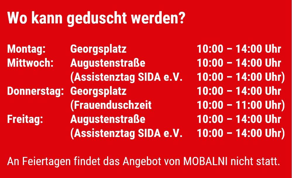 Ab dem 15.01.2026 wird das Angebot von MOBALNI donnerstags immer auf dem Georgsplatz und nicht, wie bisher, auf dem Goseriedeplatz sein. Die Frauenduschzeit ist zukünftig donnerstags von 10:00 - 11:00 Uhr.