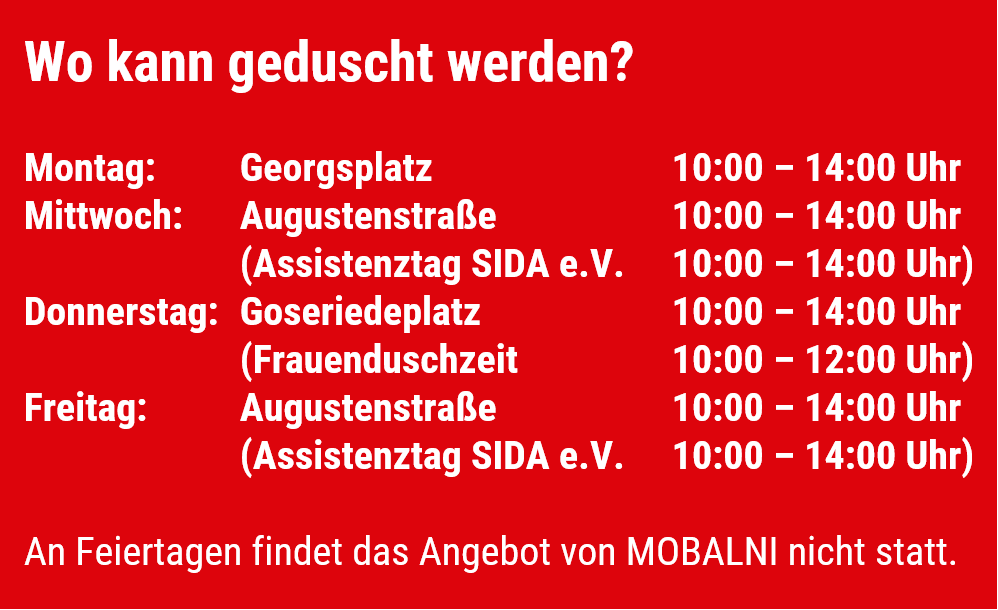 - Am Sonntag, den 14.12., ist MOBALNI bei "DIE!!! Weihnachtsfeier für Wohnungslose und Bedürftige" am HCC mit dabei. In der Zeit von 13:30 bis 18:00 Uhr kann geduscht werden.