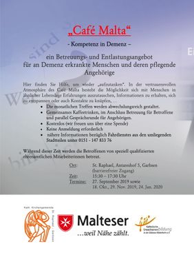 Hier setzt das Konzept des Café Malta an. Es bietet den Angehörigen in geschützter Atmosphäre Raum für ihre Sorgen und Probleme, sie haben Gelegenheit sich mit ebenfalls betroffenen Angehörigen auszutauschen oder sich bei kompetenten Mitarbeiterinnen Rat zu holen. Die Betroffenen werden gleichzeitig von qualifizierten Helferinnen des Besuchs- und Demenzdienstes der Malteser betreut. Beginn ist mit einem gemeinsamen Kaffeetrinken, daran schließt sich ein Gesprächskreis sowie die Betreuungsgruppe an. Ein Fahrdienst aus den umliegenden Stadtteilen ermöglicht auch Menschen mit eingeschränkter Mobilität den Besuch des Cafés mit barrierfreier Ausstattung.