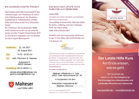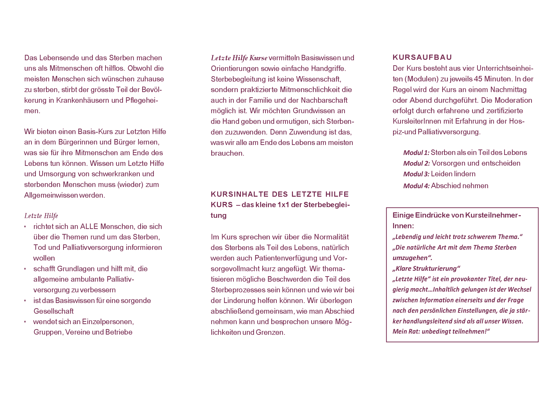 Es geht um die Sorge/das Umsorgen von schwerkranken und sterbenden Menschen am Lebensende. In Anlehnung an Erste Hilfe Kurse entstand die Idee, dass alle Menschen ganz allgemein wissen sollten, was beim Sterben passiert. Denn Sterbebegleitung ist keine Wissenschaft für Experten, sondern ein Angebot von Mensch zu Mensch. Das Wissen darum gehört zurück in die Gesellschaft, nimmt Ängste und macht Mut.