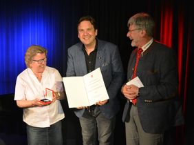 Hospizarbeit im Rampenlicht: Matthias Brodowy auf der Bühne des „Theater am Küchengarten“ mit Malteser-Dankplakette. Daneben Diözesanoberin Marie-Rose Freifrau von Boeselager und ihr Mann, Malteser-Diözesanleiter Maximilian Freiherr von Boeselager; Bildquelle: Lukas/Malteser