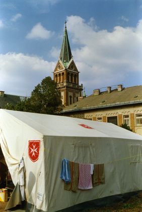 Dass die Geschichte gut ausgehen sollte – das war allen damals nicht klar. Wolfgang Triller: „Als wir nach über 20 Stunden Fahrt völlig übermüdet in Budapest ankamen, lag bei 30 Grad Außentemperatur große Anspannung in der Luft.“ Das Gelände der katholischen Pfarrgemeinde mit der Zugliget-Kirche im Zentrum war gesäumt mit Trabbis. „Wir Paderborner Malteser waren damals die ersten deutschen Helfer vor Ort und hatten bis zum 3. September die Einsatzleitung inne.“ Zuerst galt es, Hand in Hand mit den ungarischen Maltesern, für die vielen Menschen Zelte aufzubauen – insgesamt vier Dutzend „SG20“-Zelte für jeweils rund acht Menschen sowie viele weitere kleinere standen am Ende im Garten der Pfarrei. Kurzerhand wurde die Einsatzzentrale in der Sakristei der Kirche eingerichtet und die Malteser bezogen Quartier im Glockenturm. Die Bandbreite der Hilfe reichte vom Tordienst über Registrierungen, Essensausgaben bis zur Behandlung kleinerer Verletzungen und Kreislaufproblemen. „Das persönliche Gespräch war aber das Wichtigste, schließlich waren wir für die verunsicherten Menschen die erste Anlaufstelle“, sagt Wolfgang Triller.