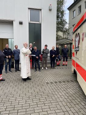 Mit ein paar Spritzern Weihwasser wurde das neue Fahrzeug durch den Malteser Stadtseelsorger Pfarrer Martin Lohoff gesegnet.