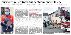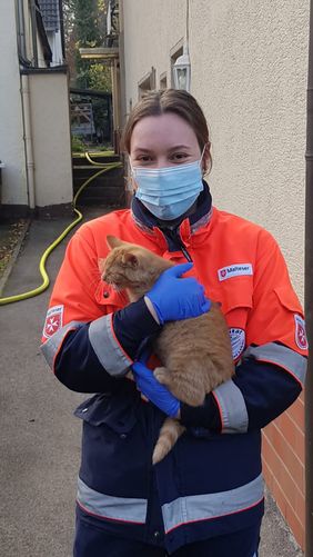 Deilinghofen. Die durch den Rauchmelder alarmierten Nachbarn konnten Schlimmeres verhindern. Sie riefen die Feuerwehr, die den Brand in einer Küche des Mehrfamilienhauses schnell löschen konnte. Annerike Arndt, 19, absolviert ein Freiwilliges Soziales Jahr bei den Maltesern in der Rettungswache in Hemer. Als die Feuerwehr zu Einsatz fährt, ist sie auf dem ebenfalls alarmierten Rettungswagen mit dabei. Zum Glück waren keine Personen betroffen. So konnte sich Annerike liebevoll um die verängstigte Katze kümmern, die anschließend bei den Nachbarn aufgenommen wurde.