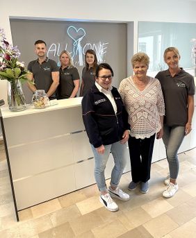 Vorne von links: Melanie Wittig vom Malteser Hausnotruf, Stanislava Gold, eine der ersten Klientinnen des Pflegedienstes, Steffi Brandt, Mitarbeiterin ALLinONE. Hinten von links: Das Geschäftsführer-Team von ALLinONE mit Robert Wagner, Vanessa Berghoff und Jennifer Temme. (Foto: Anke Buttchereit)
