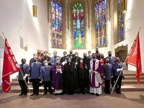 2. Bielefelder Stadtseelsorger Pastor Lars Hofnagel (vorne 3. v. r.) mit den Ausrichtern und Gästen des Gottesdienstes, der unter 3G-Bedingungen stattfand. (vorne von links: Bannerträger Dennis Funke, Andreas Liebisch, Franz Schaible, Msgr. Prof. Dr. Peter Schallenberg, Marion Freiin von Graes, stv. Diözesanleiterin und Diözesanoberin der Malteser in der Erzdiözese Paderborn, Pia Gräfin von Spee, Lars Hofnagel, Sebastian Schattner, Bannerträgerin Mia Sophie Nolte. Hintere Reihe v. l.: Bogislaw von Zitzewitz und Wolf-F. von Dallwitz (beide Johanniter Ordensritter), stv. Diözesanseelsorger Norbert Scheckel, Reinhard Zinkann, Rainer Graf Praschma, Dr. Gerhard Markus, stv. Oberbürgermeister der Stadt Bielefeld Andreas Rüther, Thomas Ohm, Malteser Präsidiumsmitglied, Benedikt Gellrich (rechts) und weitere Bielefelder Malteser Helferinnen und Helfer. (Fotos: Malteser/Anke Buttchereit)