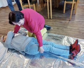 Dieser Herausforderung stellte sich Malteser Ausbilderin Martina Düllmann. Gemeinsam mit der AOK NordWest haben die Malteser diesen besonderen Erste Hilfe-Kurs auf die Beine gestellt. „Ich habe versucht, mich auf die Bedürfnisse der blinden und sehbehinderten Teilnehmenden einzustellen. Wichtig war es, klare und präzise Anweisungen zu geben“, sagt Martina Düllmann. Und natürlich musste viel mehr mündlich erklärt werden, da die bei Erste Hilfe-Kursen üblichen Folien nicht gezeigt werden konnten. „Aber die Teilnehmenden haben es mir sehr leicht gemacht. Durch ihre interessierten Fragen und die hohe Aufmerksamkeit waren die Inhalte gut vermittelbar“, berichtet die Ausbilderin der Malteser. Unter anderem wurden Verbände angelegt, die Wiederbelebung geübt, Symptome für Herzinfarkt und Schlaganfall erläutert und natürlich wurde auch die stabile Seitenlage mehrfach geprobt.