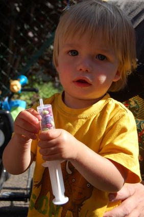Während ihre Eltern ihren Spaß an den Biertischen hatten, wurden die Kinder "in der Maske" bei Silvana Isenmann zur Fee, zum Löwen, zum Schmetterling und und und geschminkt. Außerdem wurden über 50 "Spritzen" (gefüllt mit Smarties) an die Kinder verteilt, die sich mit strahlenden Augen bedankten (siehe Foto). Schön war der Satz eines Gastes: "Mir komme noch de Kirch nomol vorbei". Am Ende des Festes freuten wir uns über sehr viele interessierte Einwohner, die Vertreter aus Freiburg und des DRK, so dass die mühevollen Aufbauarbeiten (und die Gedanken an die Abbauarbeiten) für eine Zeitlang vergessen waren. Wir konnten wieder auf zahlreiche eigene Helferinnen und Helfer aus der Jubiläumsliste von 2012 zurückgreifen. Ihr wart (mal wieder) ein tolles Team! Herzlichen Dank auch an die Bäckerei Betzler, Getränke Neumann und das Blumenfachgeschäft Reinle für die Spenden.
