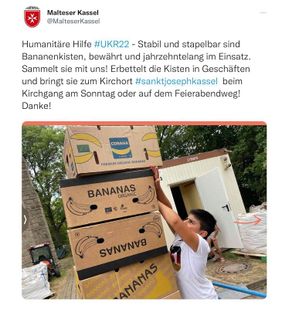 April 2022 - Der Katholische Religionslehrer und Autor Marcus C. Leitschuh aus Kassel widmet der Hilfsbereitschaft und der Kiste ("In der Kirche St. Joseph am Kasseler Rothenberg stapeln sich die Bananenkisten meterhoch...") einen eigenen Radiobeitrag _ LINK