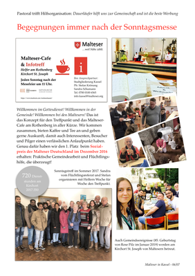 Für Hilfspfarrer und Malteserseelsorger Stefan Krönung ist das ein besonders wertvoller Beitrag für die Gemeindepastoral und zusammen mit Diakon Martin Gerstel sind beide zusammen mit einem Helferkreis ehrenamtlich dabei zu allen Jahreszeiten, oft draußen vor dem Gemeindehaus oder im Zelt. Genau dafür hat der Dienst im Jahr 2016 auch den Sozialpreis der Malteser Deutschland erhalten: Die Kombination von praktischer Gemeindearbeit, Malteser Pastoral und Flüchtlingshilfe überzeugte die Jury.