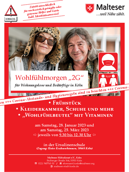 Der Wohlfühlmorgen der Kölner Malteser richtet sich bereits seit dem Jahr 2006 an Menschen, die am Rande der Gesellschaft leben. Er ist in Köln zu einer festen Institution geworden und findet mindestens viermal im Jahr statt. Ehrenamtliche und Spenden sorgen dafür, dass die Veranstaltung kostenlos angeboten werden kann. Stets können bis zu 150 Gäste zum Wohlfühlmorgen begrüßt werden. Ort der Veranstaltung ist die Erzbischöfliche Ursulinenschule. Schülerinnen der Schule unterstützen die Malteser-Helferinnen und Helfer bei der Arbeit.