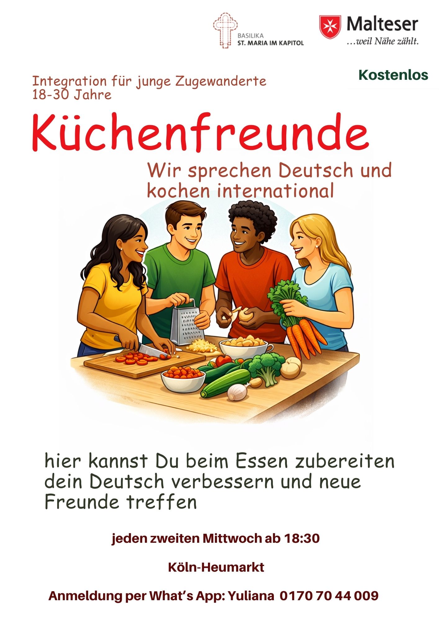 Im Projekt „Küchenfreunde“ treffen sich junge Ehrenamtliche und Zugewanderte, um gemeinsam zu kochen und dabei Deutsch zu sprechen. Was als gemeinsamer Kochabend beginnt, entwickelt sich schnell zu einem lebendigen Sprach- und Begegnungsangebot.