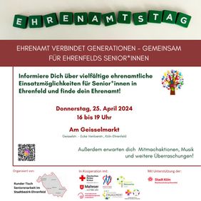 Am Donnerstag, 25.04.2024, findet von 16.00 bis 19.00 h eine Engagement-Börse speziell für den Stadtbezirk Ehrenfeld statt, organisiert vom Runden Tisch Seniorenarbeit im Bezirk Ehrenfeld. Wir als Malteser sind dort mit der Residenz Ehrenfeld vertreten, weil wir für das soziale Angebot und Aktivitäten dort weitere ehrenamtliche Unterstützung gebrauchen können.