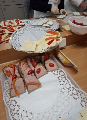 sowie zahlreiche Schnittchen zu schmieren und garnieren, die später von den Schülerinnen im Speiseraum angeboten wurden.