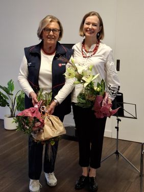 Zusätzlich konnten neun Personen (davon zwei ehrenamtliche Begleiter) vom Integrationsdienst und fünf ukrainische Soldaten an dem Konzert teilnehmen, von denen viele die vertrauten Klänge aus ihrer Heimat ganz besonders freute. Außerdem fand ein guter Austausch zwischen den Teilnehmenden der verschiedenen Gruppen statt. Musik verbindet – Svitlana Kavka gelingt dies mit ihrer sehr empathischen Art und der guten Idee, die Sprache in einigen Lieder zu wechseln … Ukrainisch, Deutsch, Englisch … ganz besonders gut. KBD-Diensteleiterin Irmtraut Reyss überreichte der Künstlerin als Dankeschön einen Blumenstrauß.